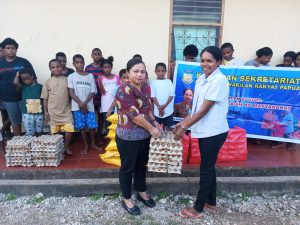 “Saya sebenarnya berencana hadir langsung, tetapi karena ada pertemuan penting, maka saya tugaskan staf untuk menyerahkan bantuan ini. Yang penting kunjungan kasih kami bisa sampai dan bermanfaat bagi anak-anak di sini, ” ujar Dr. Juliana J. Waromi.